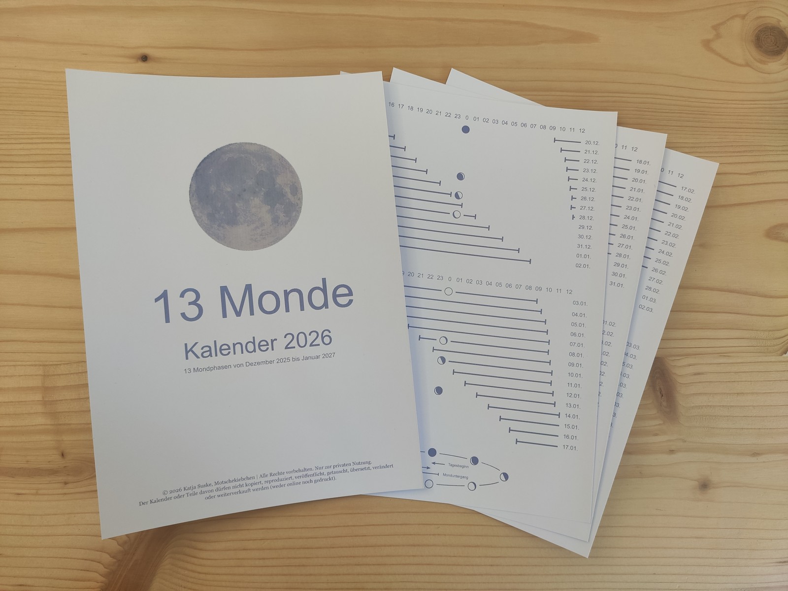 13 Monde beinhaltet 13 Mondphasen von Dezember 2025 bis Januar 2027. Als PDF-Datei zum Download.