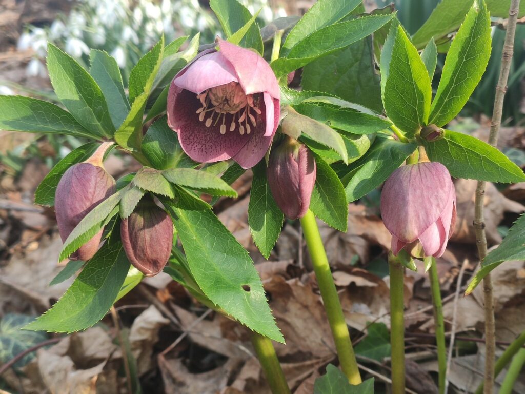 Nieswurz und Duftveilchen sind immergrüne Pflanzen. Die Schneerose blüht bereits Anfang des Jahres. Die Blüten der Lenzrose hatte ich schon das letzte Mal entdeckt. Nun haben sie sich geöffnet. Und auch das Duftveilchen reiht sich in die Frühjahrsblüher ein.
